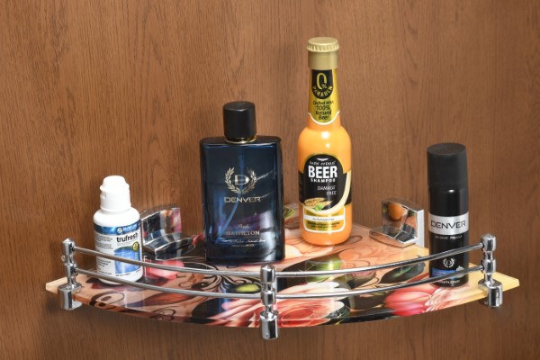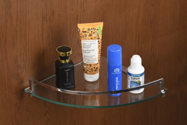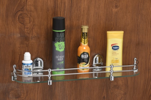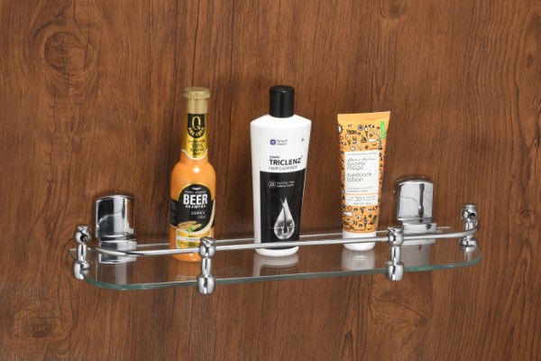 This type of shelf is generally made using 8 mm thick tempered or toughened glass, which is commonly used for wall shelves because of its structural strength and durability. Tempered glass is produced through a controlled heating and cooling process that improves its resistance to impact and temperature changes, making it suitable for household applications.